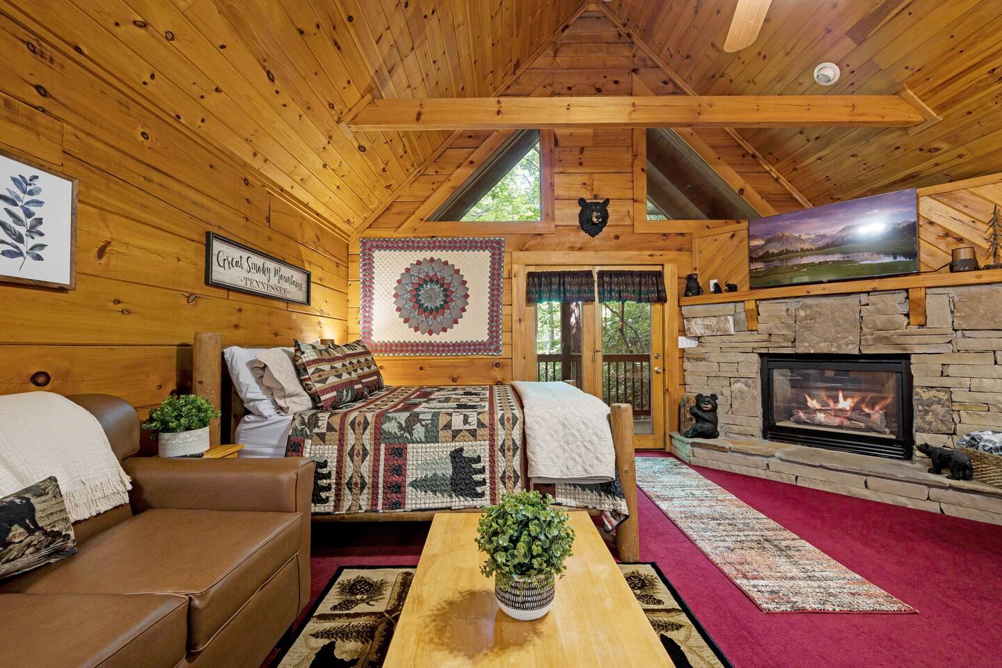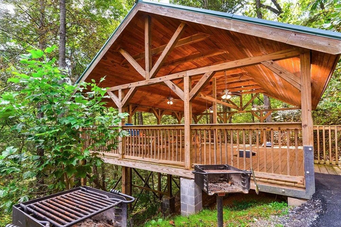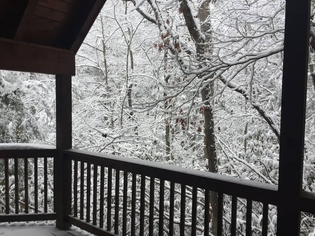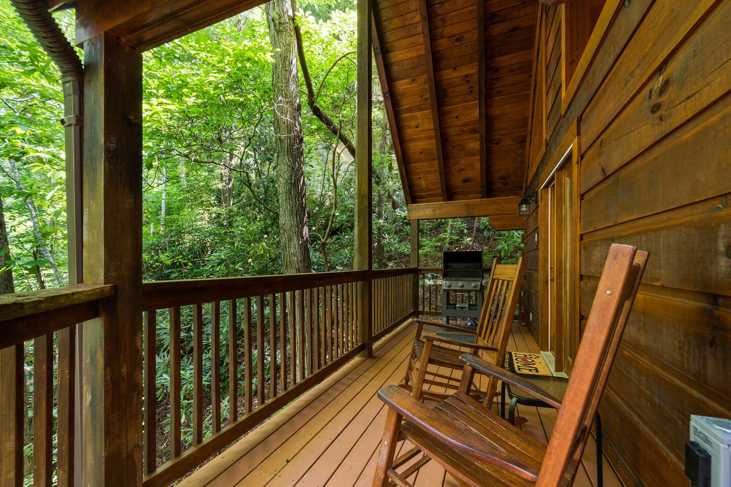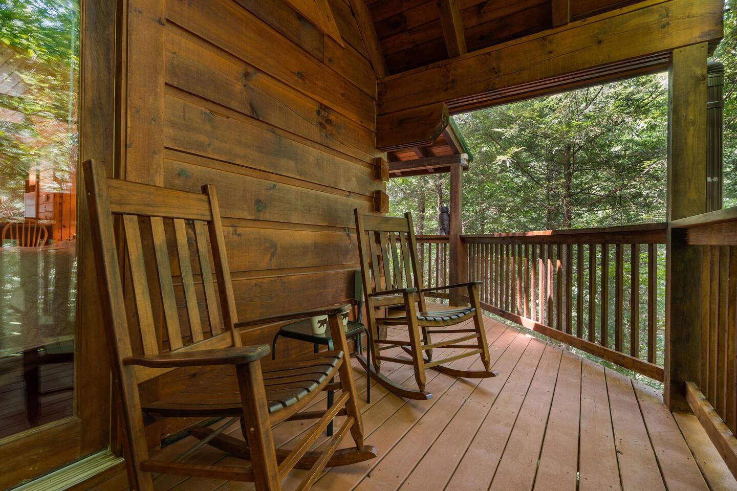 The cabin is a studio cabin. Its best feature is the wrap-around back deck. It is nestled high, within the lush trees, offering a private intimate experience. Excellent for relaxing and unwinding. Here, you won't hear your neighbors - you will hear the calming nature of the Smoky Mountains.
