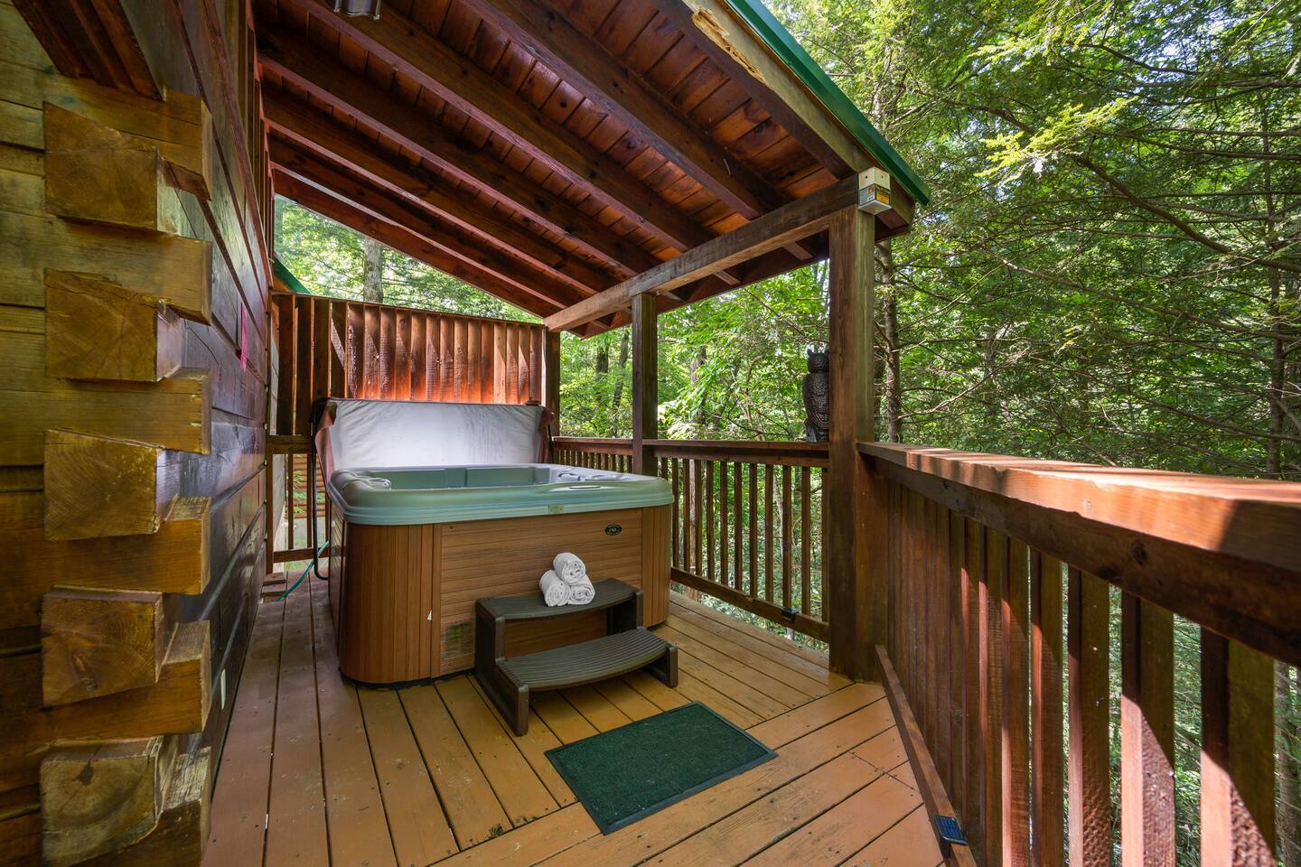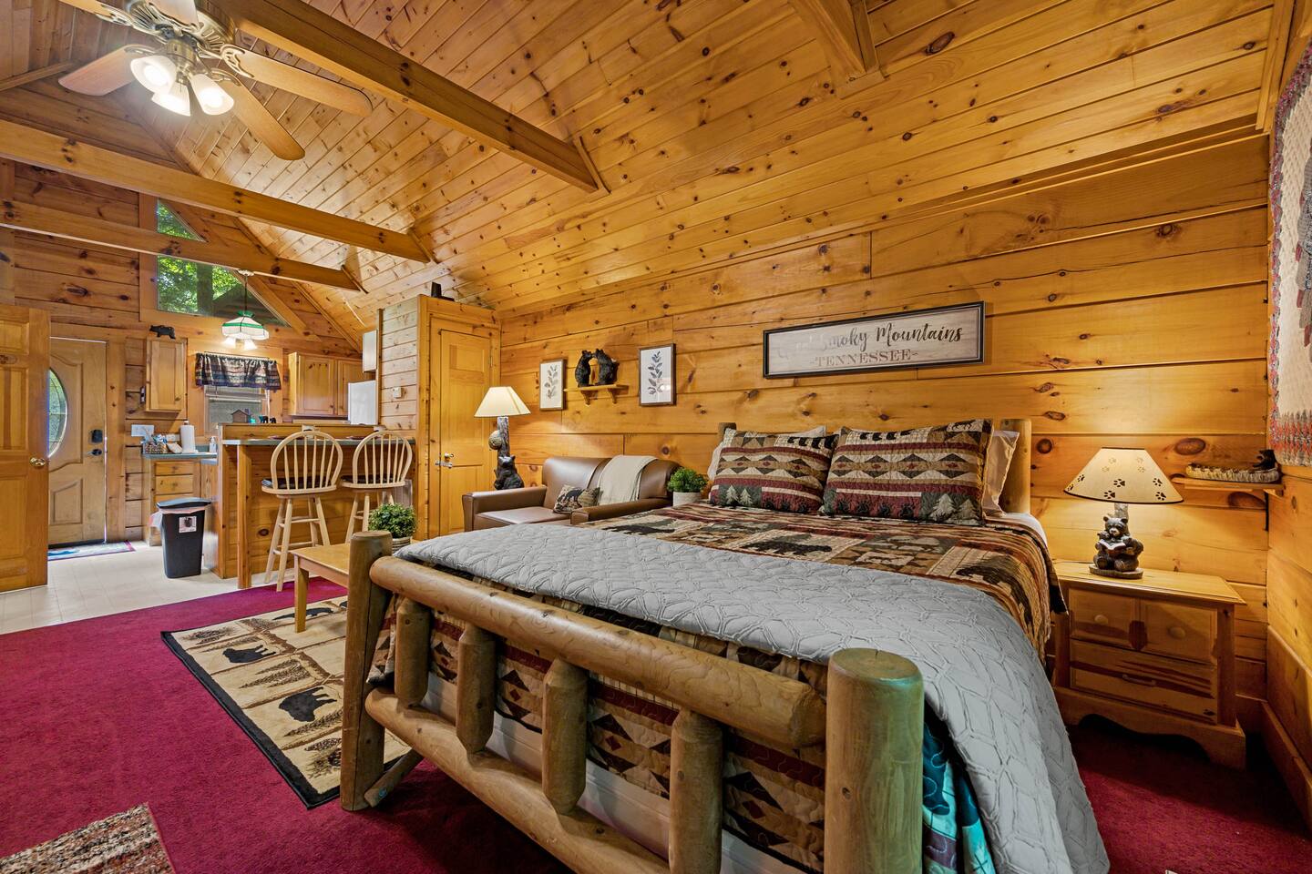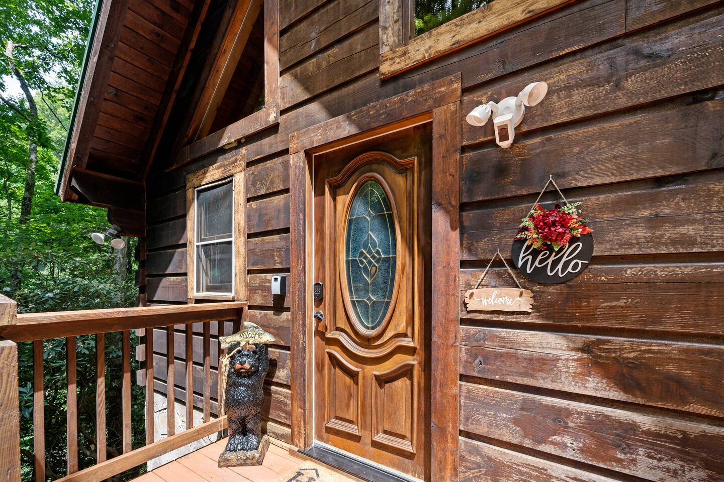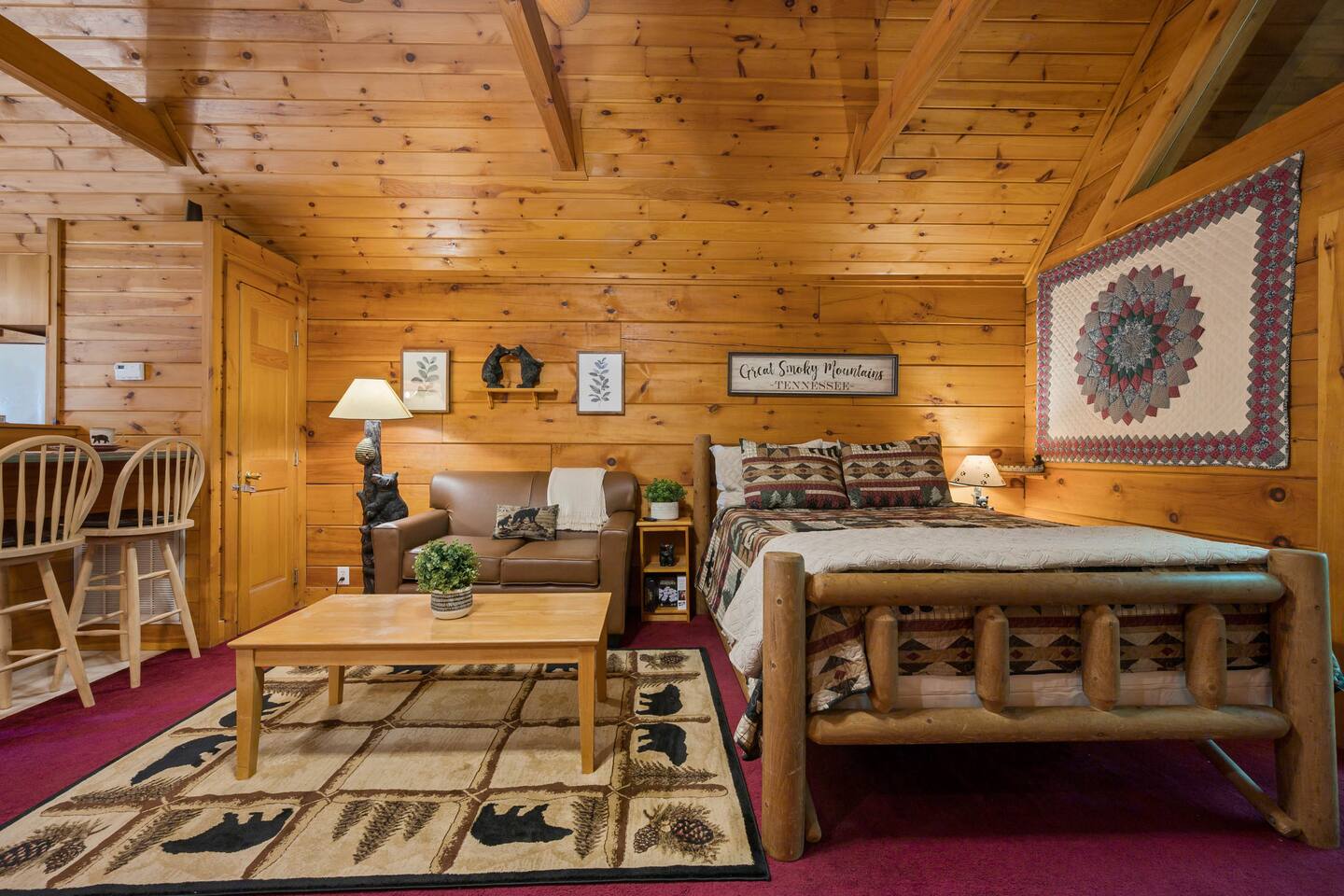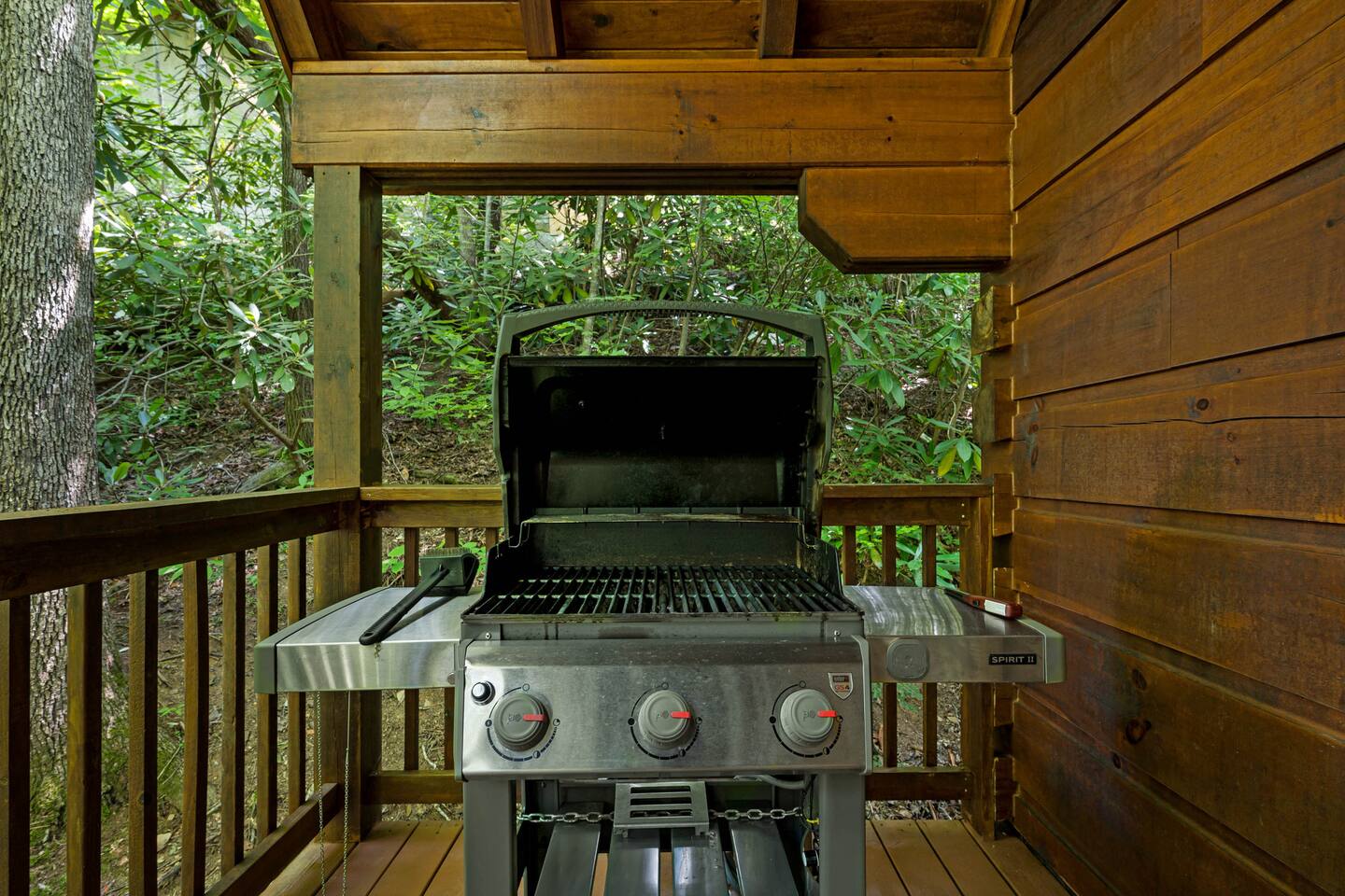 The cabin is a studio cabin. Its best feature is the wrap-around back deck. It is nestled high, within the lush trees, offering a private intimate experience. Excellent for relaxing and unwinding. Here, you won't hear your neighbors - you will hear the calming nature of the Smoky Mountains.