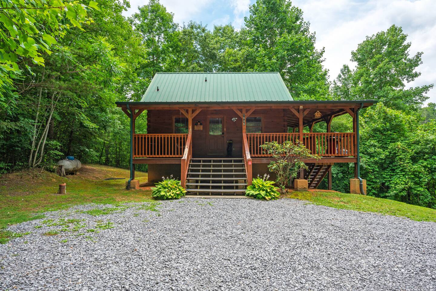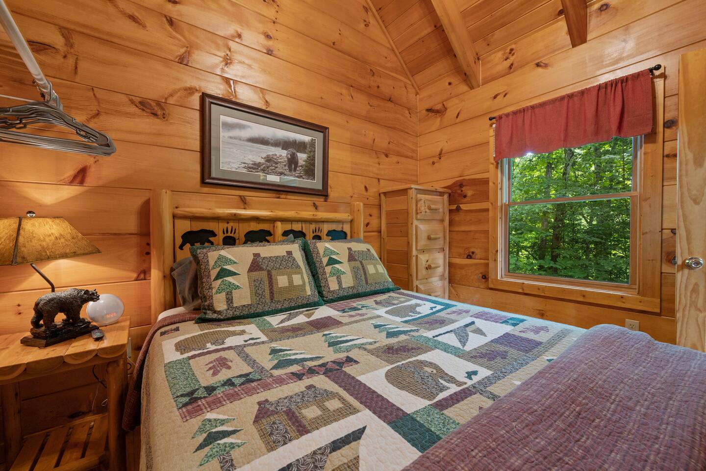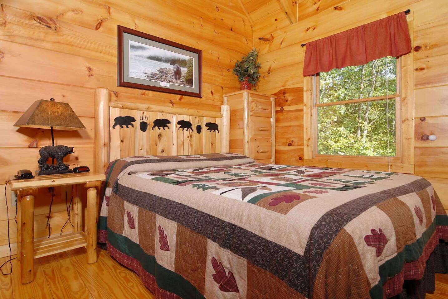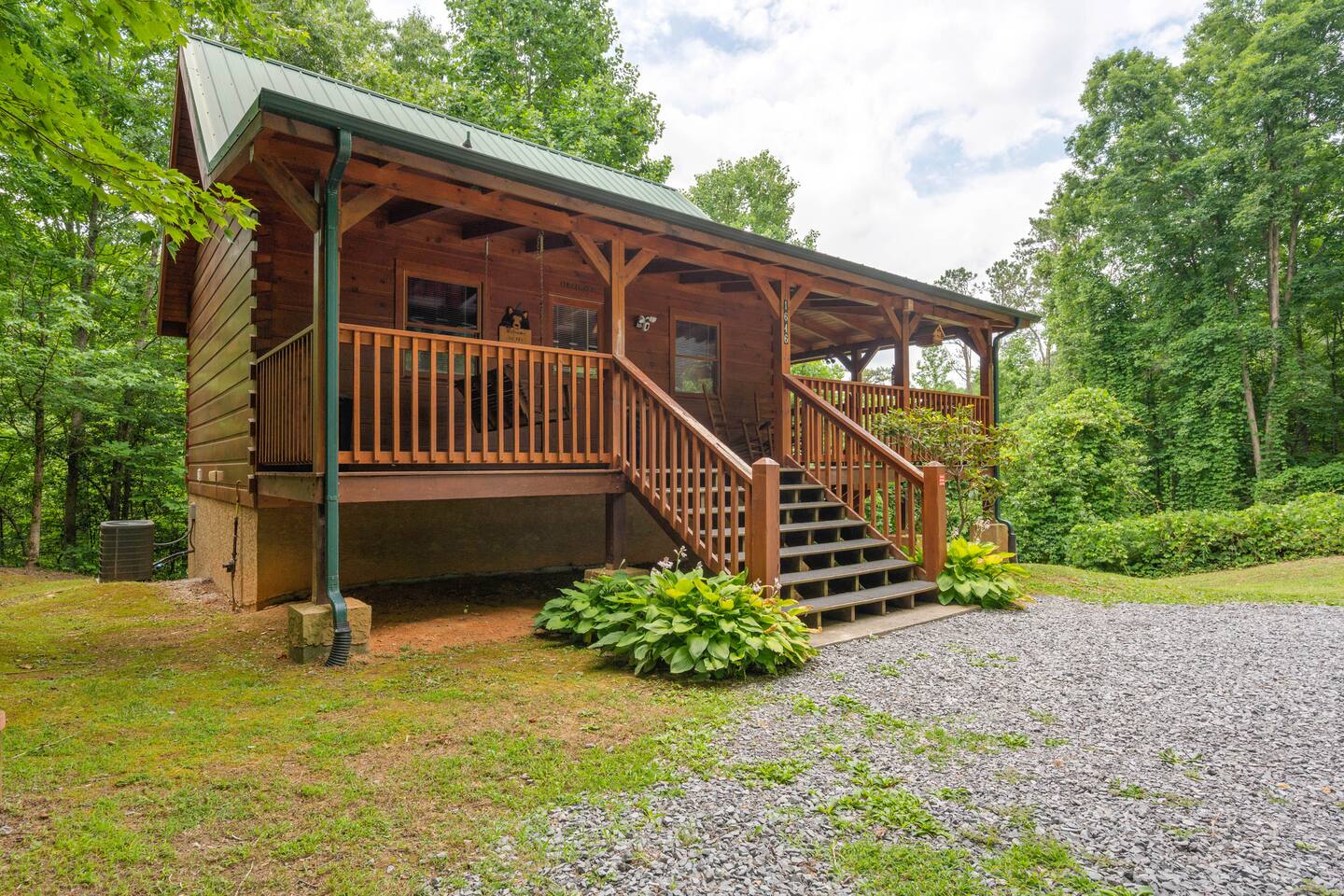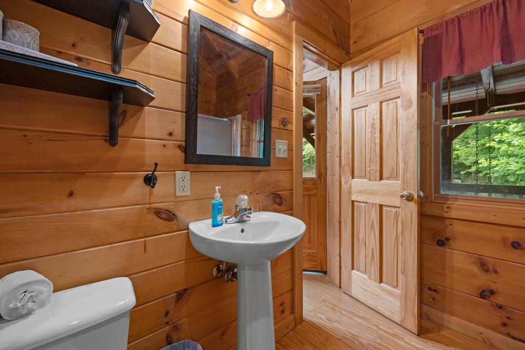 Cabin in the heart of the Arts & Crafts area: 1Bed, 1Bath, Sleeps 6. Close to everything! 10 MIN to Downtown GAT & PF. Mountain Lake Hideaway is a stunning & private two-level log cabin with 1 bedroom, 1 bathroom, & a separate entrance downstairs game room located in a natural wooded setting offering the feeling of tranquility with wooded mountain views & within walking distance to a nearby pond. Our cabin has plenty of open space, a Gas BBQ, and a private hot tub!