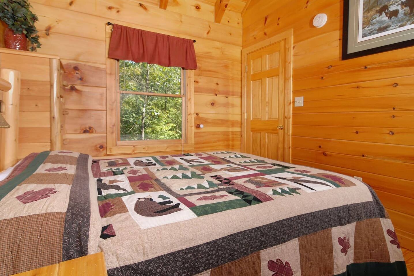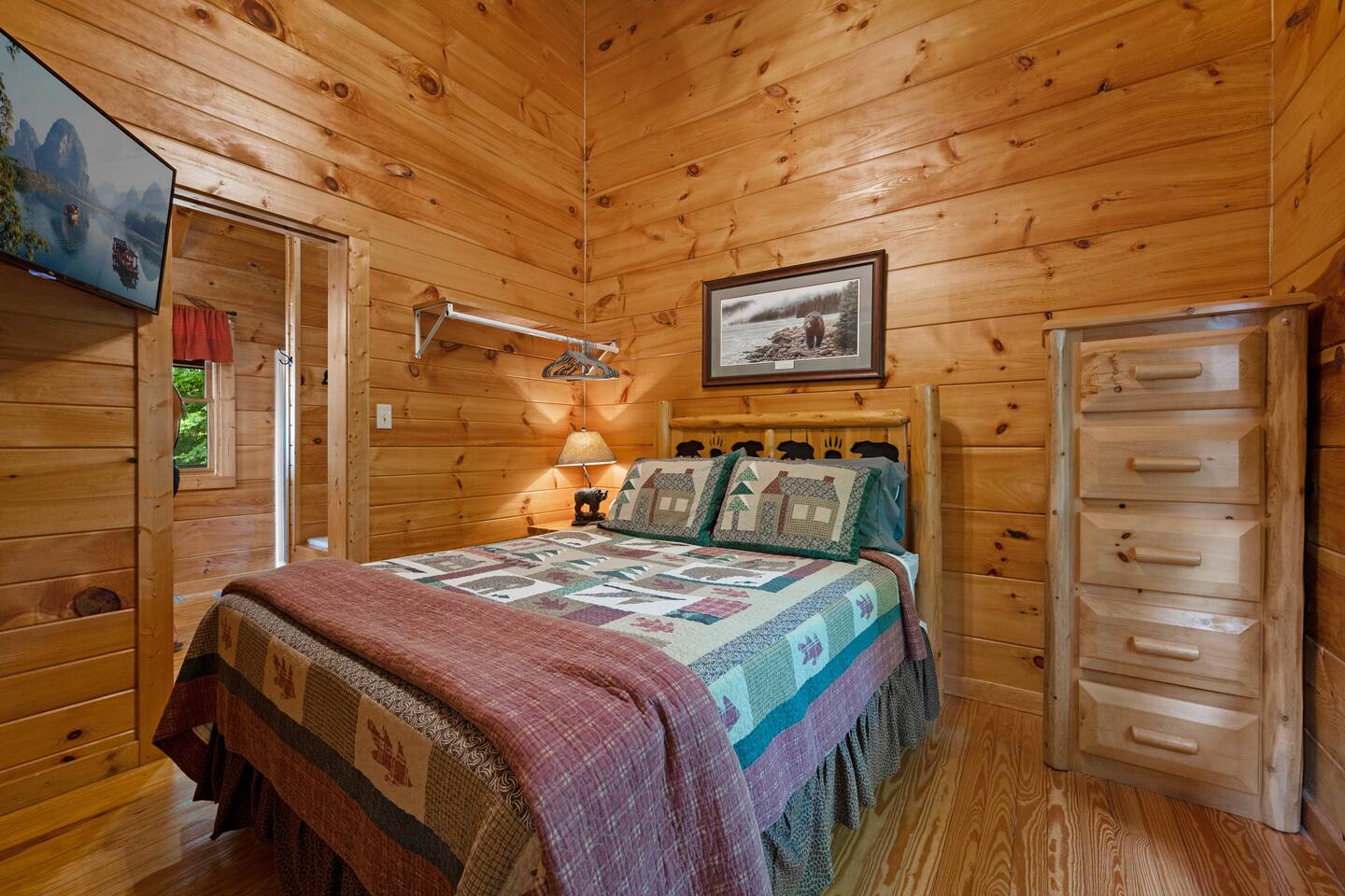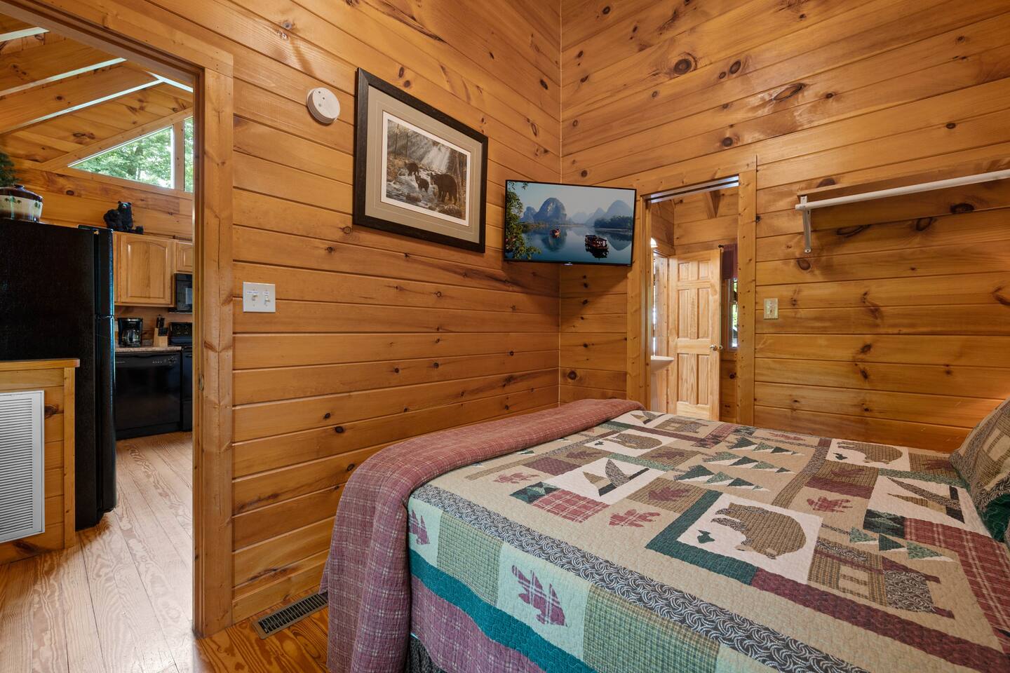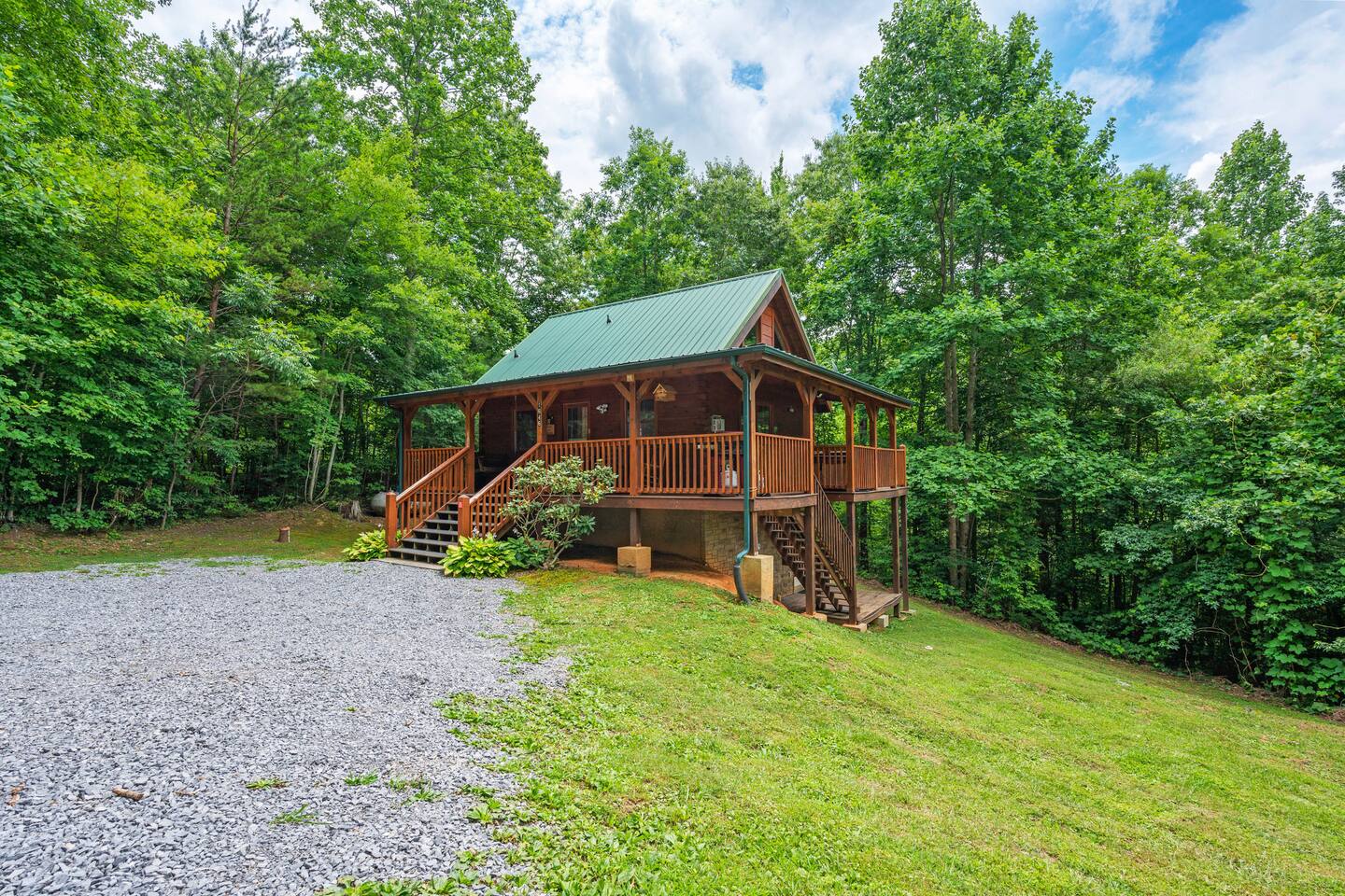 Cabin in the heart of the Arts & Crafts area: 1Bed, 1Bath, Sleeps 6. Close to everything! 10 MIN to Downtown GAT & PF. Mountain Lake Hideaway is a stunning & private two-level log cabin with 1 bedroom, 1 bathroom, & a separate entrance downstairs game room located in a natural wooded setting offering the feeling of tranquility with wooded mountain views & within walking distance to a nearby pond. Our cabin has plenty of open space, a Gas BBQ, and a private hot tub!